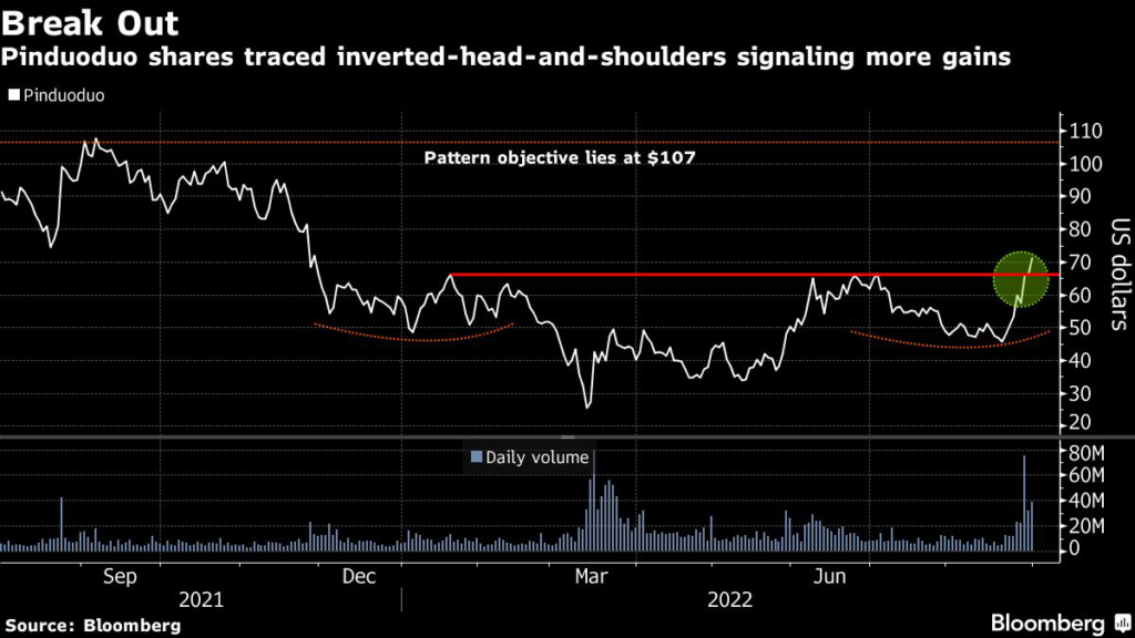 Pinduoduo’s shares have broken out of a so-called inverted-head-and-shoulders formation on high volumes.