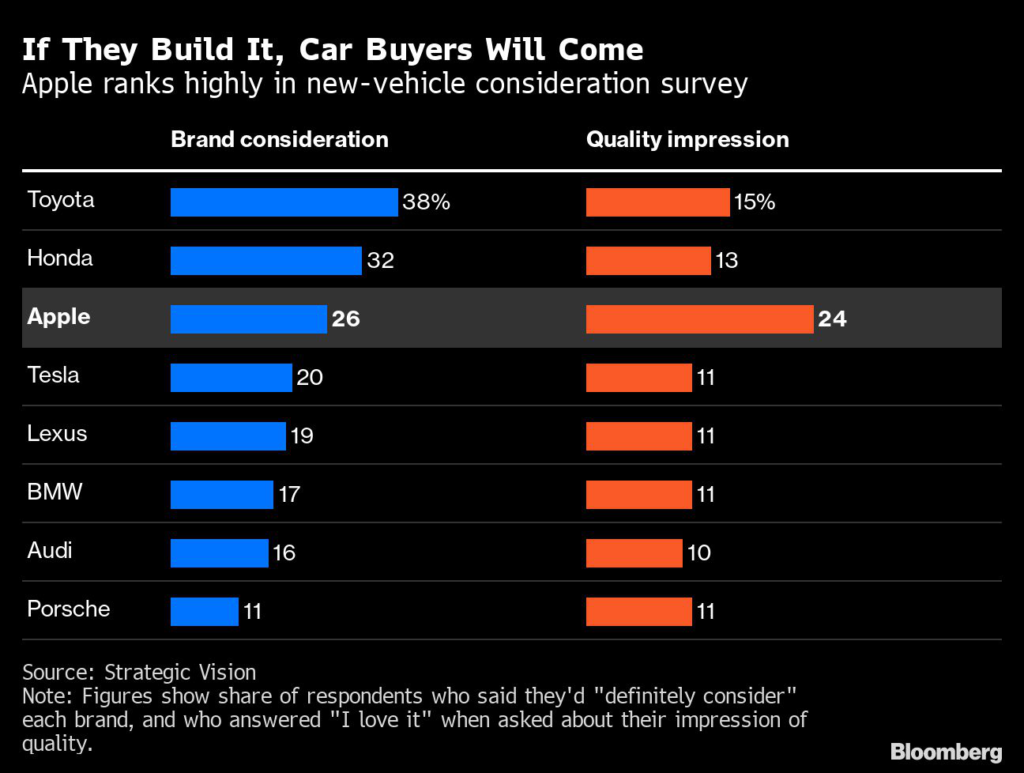 For the first time, the consulting firm included Apple among the more than 45 brands it surveyed consumers about. The findings: 26% said they would “definitely consider” buying a set of wheels from the iPhone maker, behind only Toyota and Honda.