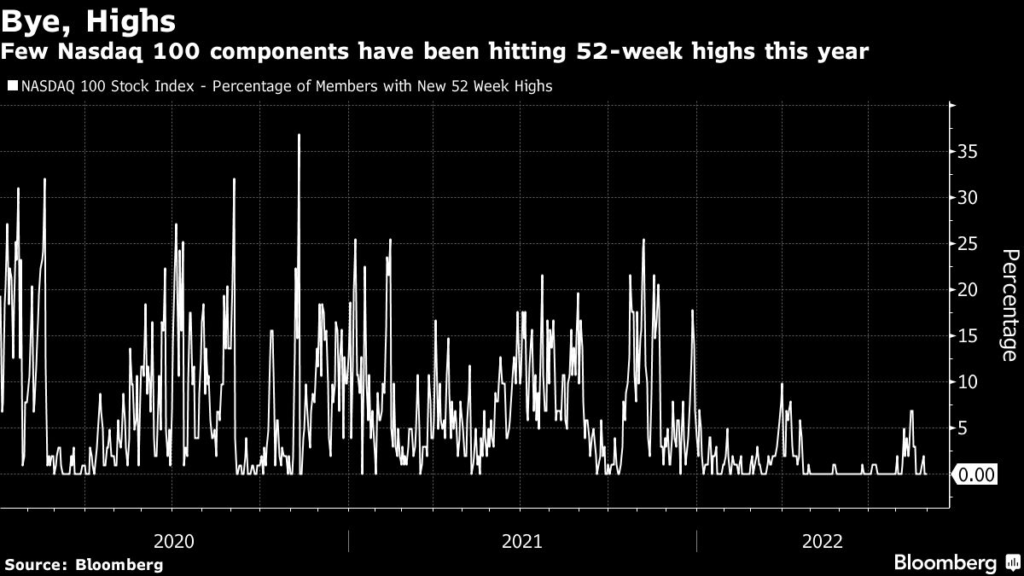 The weakness in the Nasdaq 100 Index throughout 2022 has meant an anemic number of companies hitting new 52-week highs, with none currently at such a peak.