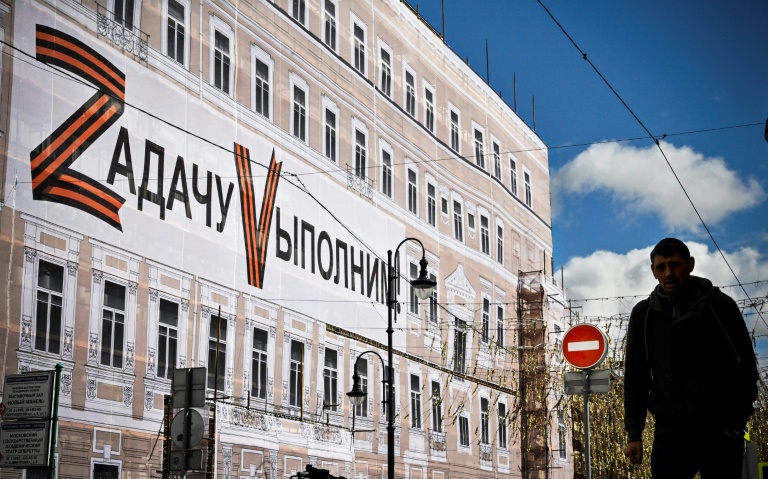 The Bolshoi Theatre is emblazoned with the letters Z and V — symbols of Russian troops in Ukraine — and the slogan 'We'll Fulfil the Task'