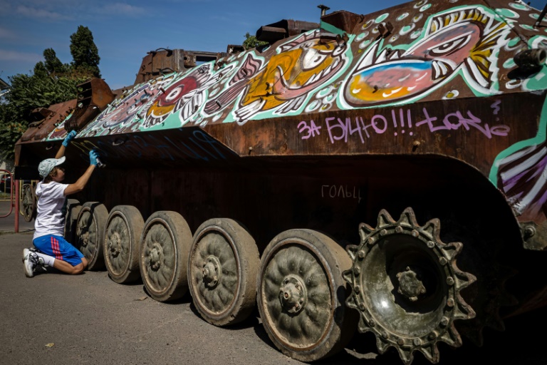 A boy spraypaints destroyed Russian military equipment in Odessa