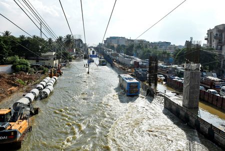 BENGALURU (Reuters) – Large parts of India’s tech capital Bengaluru were under water on Monday after torrential rains uprooted trees, caused crippling traffic and forced offices to issue work-from-home orders to employees, raising fears of further disruptions through the week.