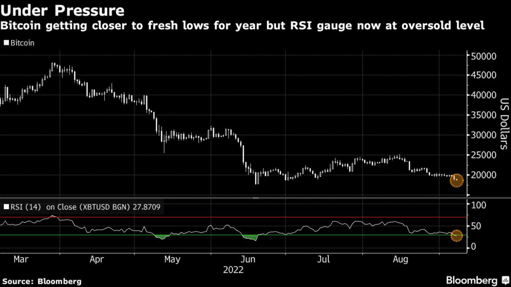 The retreat in Bitcoin is taking it closer to a nadir of about $17,600 that was hit in June in the wake of blowups at crypto lenders and hedge funds.
