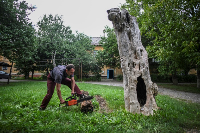 In a lush garden between two apartment blocks in the city of Kramatorsk, Oleskandr Matviyevsky chops dead trees into kindling.