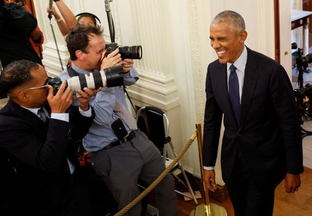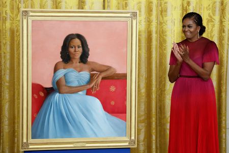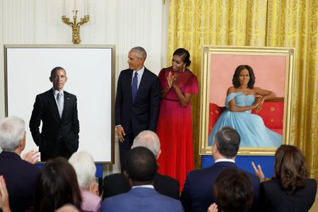 WASHINGTON (Reuters) -Former President Barack Obama and his wife, former first lady Michelle Obama, returned to the White House on Wednesday to unveil their official portraits in an event punctuated by wisecracks but tinged with history and politics.