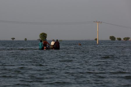BHAN SYEDABAD, Pakistan (Reuters) – People were building barriers in some parts of Pakistan on Thursday to hold back rising waters that have engulfed nearly a third of the country after weeks of rain, while officials said 12 more deaths took the toll to 1,355.