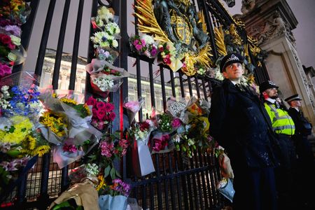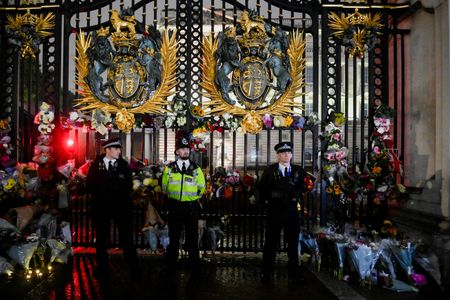 LONDON (Reuters) – Thousands of people gathered outside Buckingham Palace in London, shedding tears and singing “God Save the Queen” in an impromptu show of emotion as news emerged that Queen Elizabeth had died.
