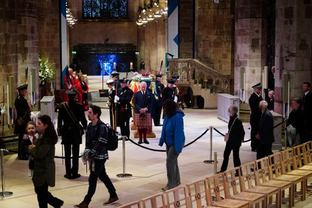 EDINBURGH (Reuters) – King Charles and his siblings held a silent vigil at the side of their mother Queen Elizabeth’s coffin as it lay at rest in Edinburgh’s historic cathedral, with thousands queuing for hours to pay their respects to Britain’s longest-serving monarch.