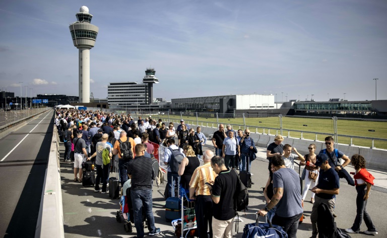 Passengers have had to stand in huge line for hours before catching flights at Amsterdam's Schiphol airport