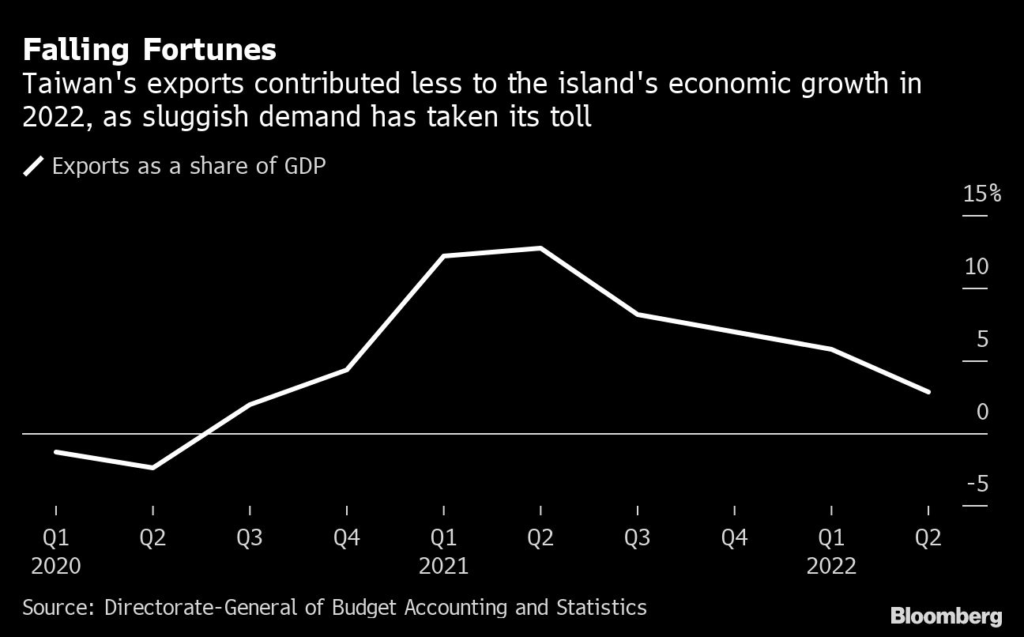 Overseas shipments have also been hurt by global inflation, rising interest rates, and Russia’s war in Ukraine, which have have cut into demand from US and Europe, said Beatrice Tsai, chief statistician of the Ministry of Finance.