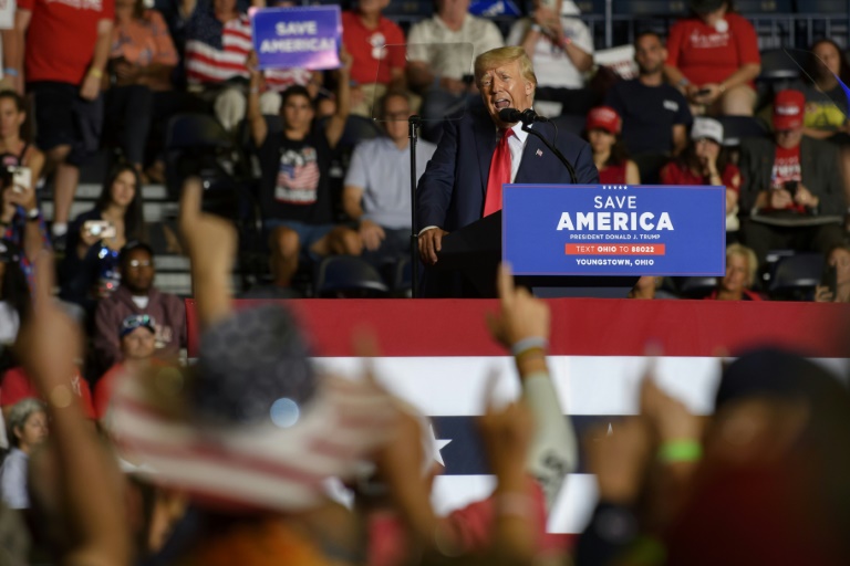 Followers of Donald Trump point their fingers to the sky as the former US president speaks at a rally in Youngstown, Ohio