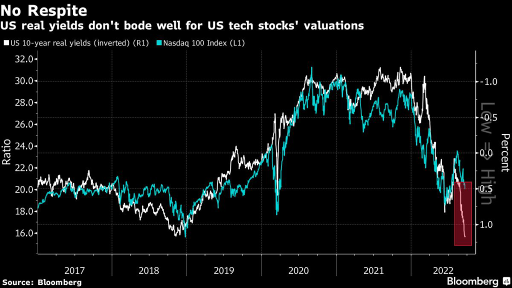 As long as real yields in the bond market keep going up, tech stocks probably haven’t bottomed, arguing against buying into the Nasdaq 100.