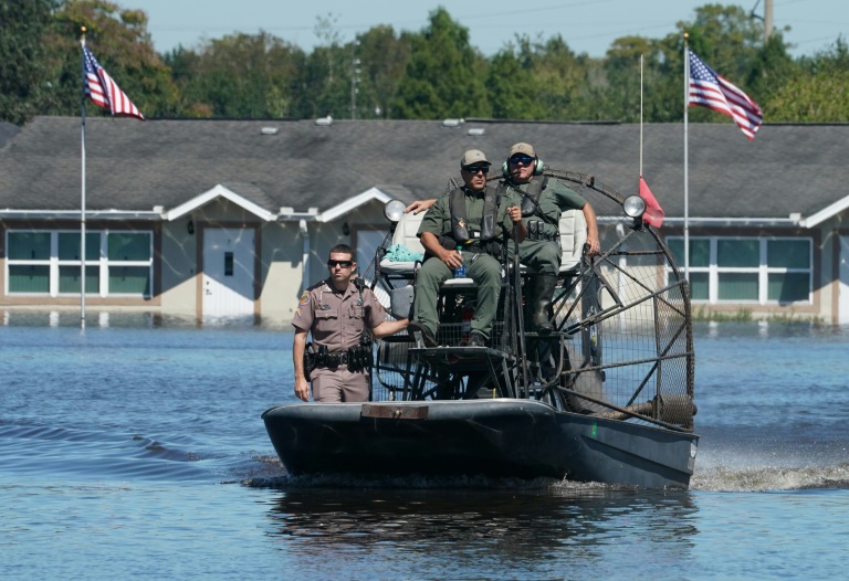 The Osceola County Sheriff's department uses a boat as they urge residents to leave the flooded Good Samaritan Society Village in Kissimmee, Florida