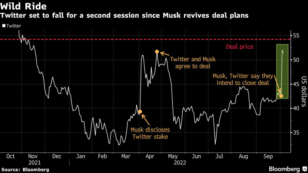Stock markets are still not entirely sold on Elon Musk’s $44 billion takeover of Twitter Inc. after the billionaire revived the deal at its original price earlier this week.