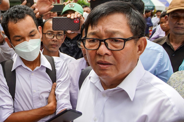Cambodian opposition politician Son Chhay speaks outside court in Phnom Penh on Friday