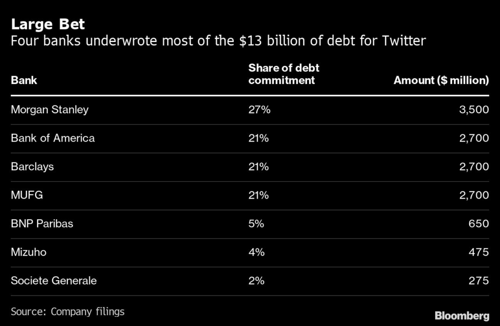 Representatives for Morgan Stanley, Bank of America, Barclays, MUFG and Twitter declined to comment.