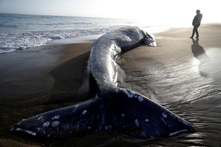 LOS ANGELES (Reuters) – The number of gray whales migrating along the Pacific Coast of North America has steadily declined by nearly 40% from a 2016 peak, and the population produced its fewest calves on record this year, according to U.S.