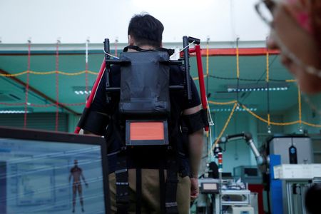 Working on a three-acre (1.2-hectare) family estate, he was part of a team trying to perfect the gadget, called a wearable exoskeleton, that promises to reduce the need for labourers to manipulate the poles, which can weigh as much as 8 kg (18 lbs).