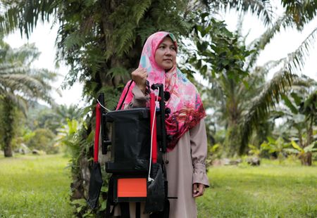 YONG PENG, Malaysia (Reuters) – Malaysian research student Haziq Ramli wore an outfit resembling a light jetpack, with poles strapped to his biceps, to wield a long pole that clipped the sharp fronds and heavy bunches of fruit from oil palm trees nearly twice his height.