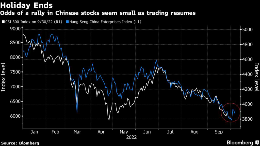 Other trends last week showed a sharp slide in holiday spending, a rebound in virus cases and no respite from the property crisis. The CSI 300 Index, mainland China’s equity benchmark, went into the weeklong break near its lowest since April 2020.