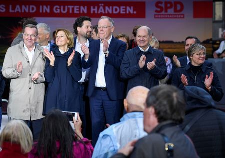 BERLIN (Reuters) -A regional election in Lower Saxony delivered mixed fortunes for German Chancellor Olaf Scholz’s national ruling coalition on Sunday, with his Social Democrats scoring a clear win but the Free Democrats barely on track to scrape into parliament.