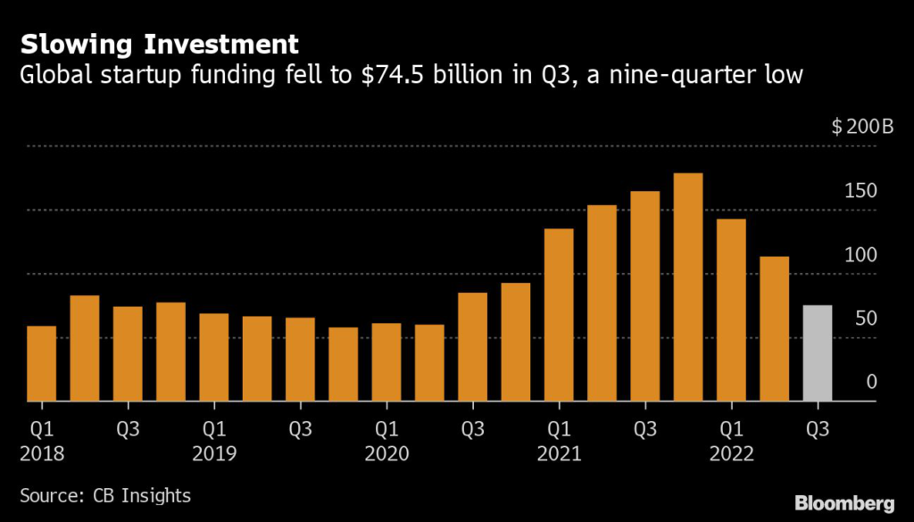 Global venture funding slumped to $74.5 billion in the past three months, its lowest level in nine quarters, according to CB Insights. That represents a 34% quarterly drop, the biggest in a decade.