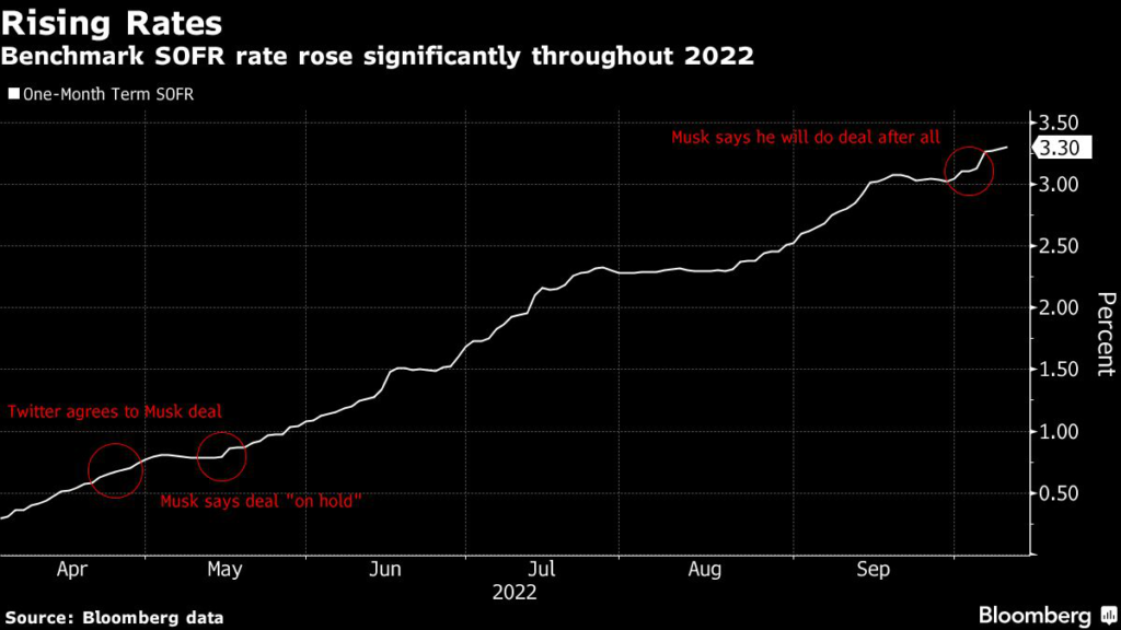 The one-month term version of this benchmark, which is commonly used in corporate lending, has increased by nearly 3 percentage points since Musk announced the acquisition in April, and is closely related to the Fed’s interest rate.