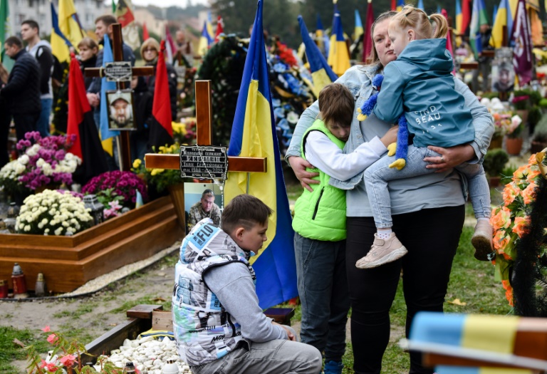 Ukrainians grieve at soldiers' graves in a Lviv cemetery on Defenders Day