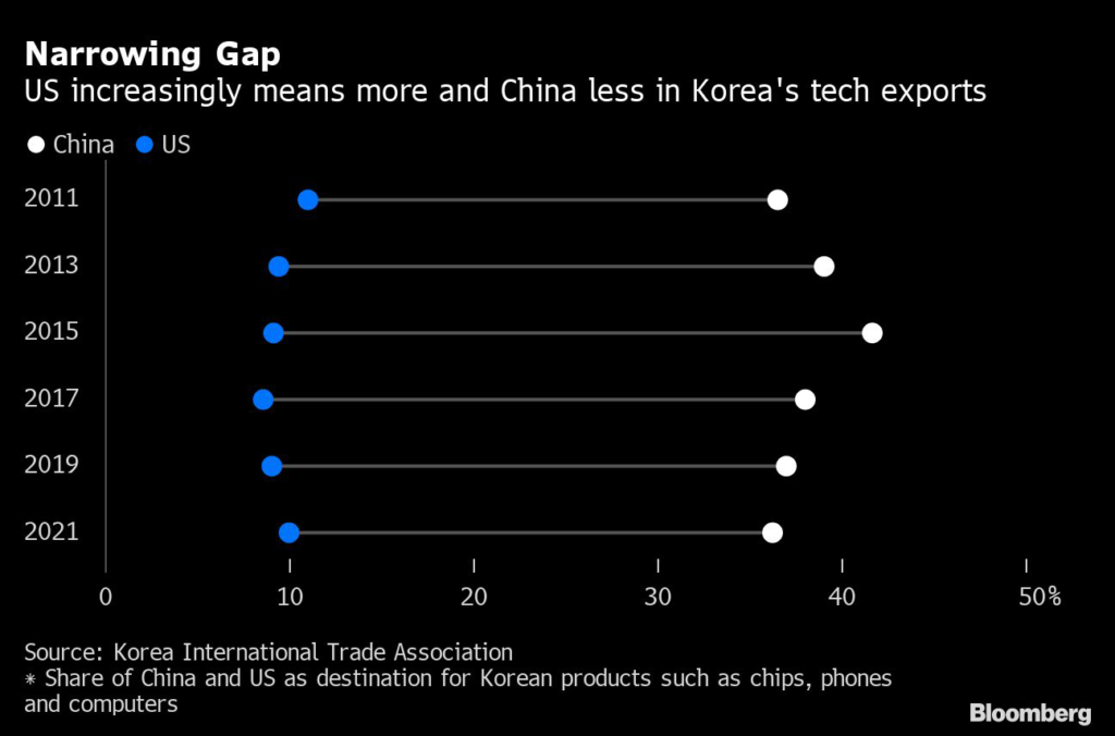 South Korea finds itself caught between its biggest trade partner in China and its US security partner over the Biden administration’s plans to secure supply chains for crucial components that steer clear of the government in Beijing.