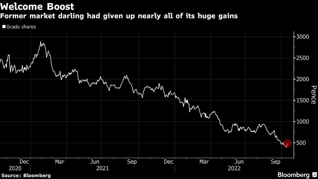 (Bloomberg) — Ocado Group Plc’s stock has gotten a much-needed boost from merger news involving one of its partners, stemming a slump that had seen the technology-focused UK grocer lose three quarters of its value this year.