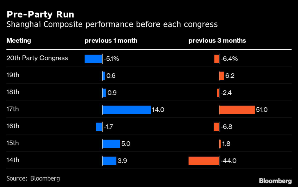 Sunday brings a historic moment for Xi Jinping’s political legacy, but investors are far less excited about the prospects of a market turnaround: Chinese stocks have never performed so poorly in the run-up to any Communist Party Congress.