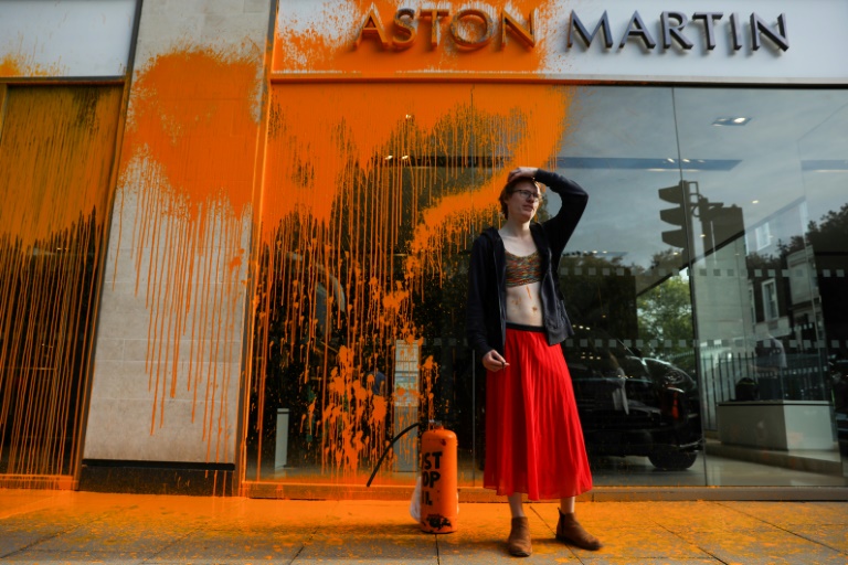 Climate activists on Sunday sprayed orange paint over an Aston Martin showroom in central London, as the government vowed new powers for police to halt an intensifying wave of “direct action” protests.