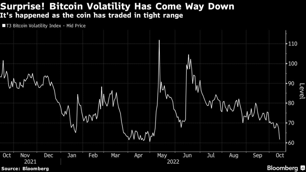 A volatility gauge for Bitcoin has dropped in recent days to its lowest level since April, reaching 61 on Friday.