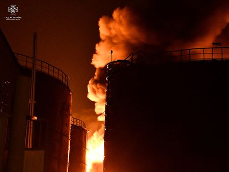 The regional emergencies service published photos of huge tanks with flames and smoke rising over them.