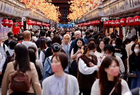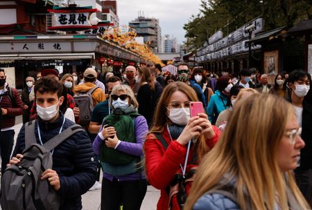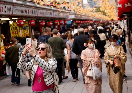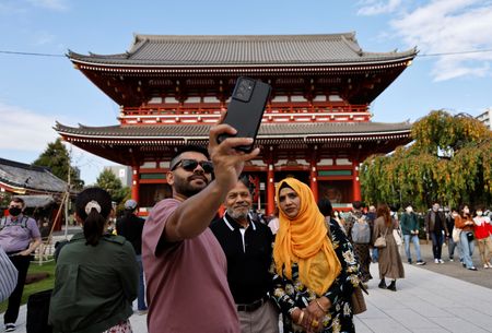 TOKYO (Reuters) -Japan is aiming to earn 5 trillion yen ($34 billion) or more from tourists over the next financial year, a draft economic package seen by Reuters showed on Tuesday, as policymakers hope to use the weak yen to attract foreign visitors.
