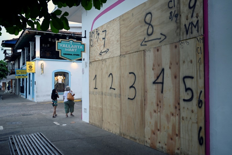 Businesses in the tourist area of Puerto Vallarta in Jalisco state, Mexico, boarded up shopfronts in preparation for Hurricane Roslyn's landfall
