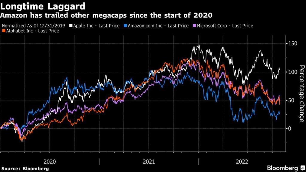 (Bloomberg) — In both bull market and bear over the past two years, Amazon.com Inc.’s shares have lagged behind those of other megacap companies, and tepid results from some of its biggest peers suggest a long-awaited rebound could remain elusive.