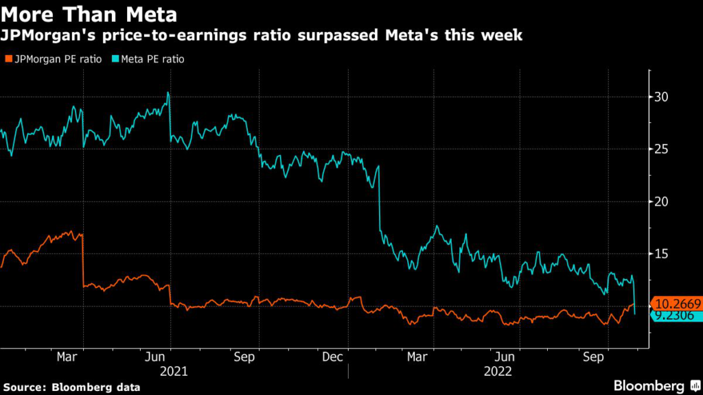 Even JPMorgan’s price-to-earnings ratio — comparing the price of the company’s stock to its earnings per share — is now higher than Meta’s in a sign that investors have more faith in the centuries-old lender’s ability to grow.