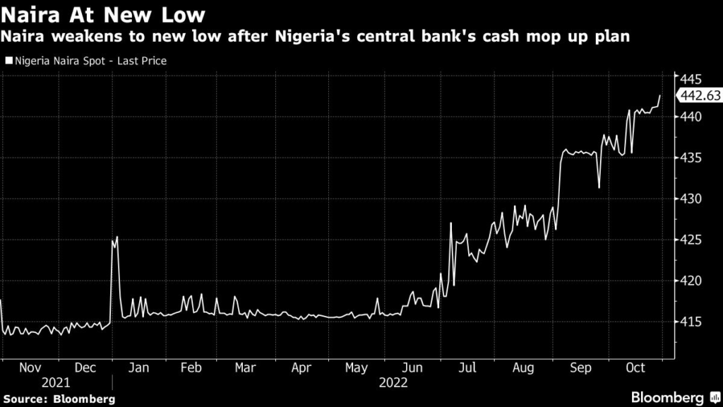 The naira fell on the official market, where it touched a record 442.62 naira to the dollar before regaining some lost ground.