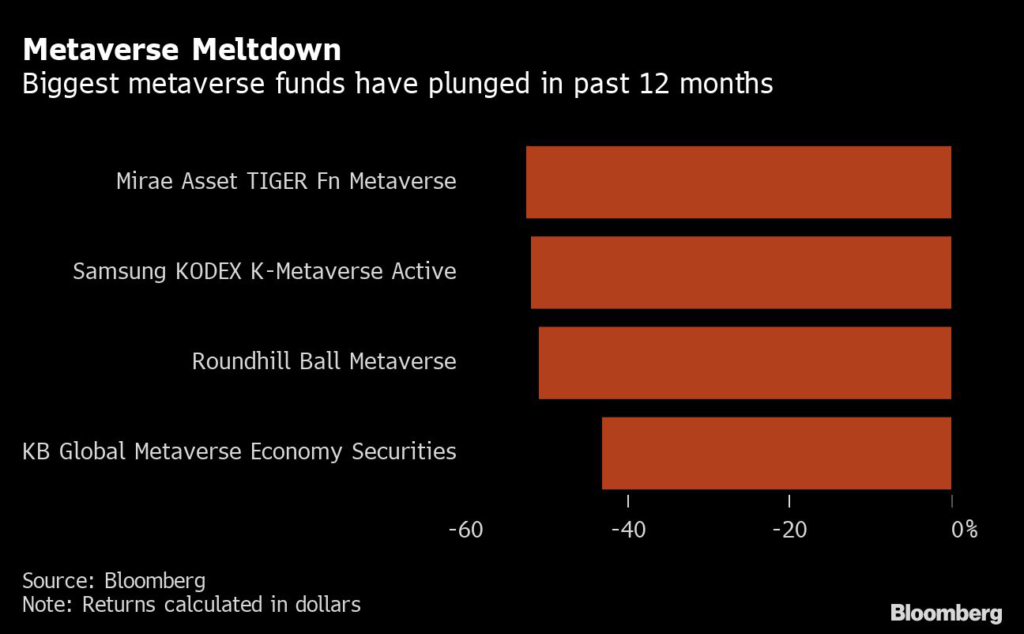 The four dozen exchange-traded funds and mutual funds in the Bloomberg database that have the word “metaverse” in their description — many of them introduced in the past 12 months — have plunged in the bear market.