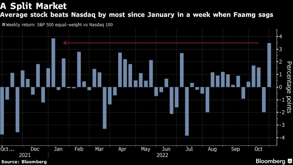 In fact, the equal-weight S&P 500 beat the cap-weighted, tech-heavy Nasdaq 100 by 3.4 percentage points, the most since January.
