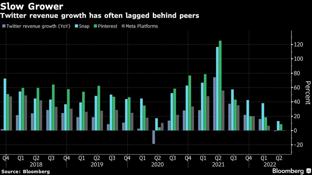 Over the past five years, Twitter has averaged quarterly revenue growth of 19%, compared with 29% at Meta Platforms Inc., 50% for Snap Inc., and 51% for Pinterest Inc.