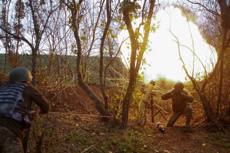 Ukrainian soldiers manning a 120 mm mortar hidden in bushes loosed high explosive rounds in thundering bursts of flame at Russian positions around a grain silo less than a kilometre away.