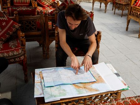 His trip to Egypt is part of a long-term project to visit 100 countries in 10 years without flying, busking with his violin to earn enough to go on.