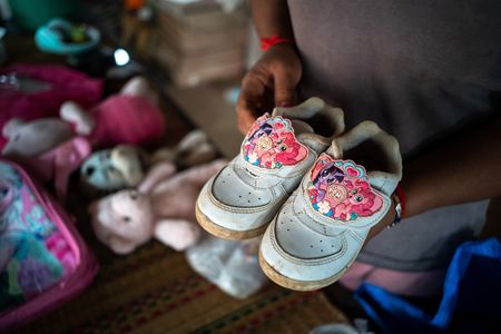 Model’s belongings – tiny sneakers adorned with cartoons, a stuffed Piglet toy, a pink backpack with pictures from the Disney movie Frozen – lay strewn about their house.