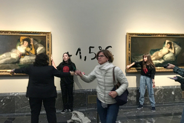 Two climate activists on Saturday each glued a hand to the frames of two paintings by Spanish master Francisco Goya at the Prado museum in Madrid, police said.