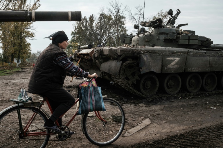 A local resident rides past an abandoned Russian tank marked Z near Kharkiv in Ukraine on September 30, 2022