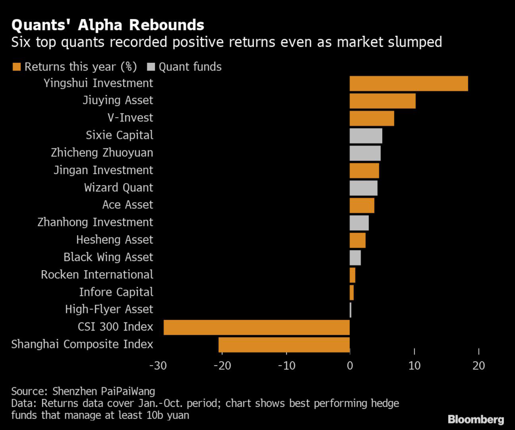 “Quant funds’ alpha has gradually turned positive this year,” bolstering their appeal to investors, said Qu Tao, head of financial engineering at China Merchants Securities Co., the largest custodian bank of hedge funds in China.