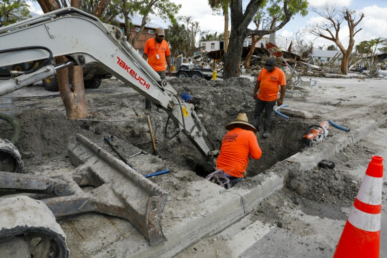 Construction workers toil to restore services on Fort Myers Beach, Florida, on November 2, 2022