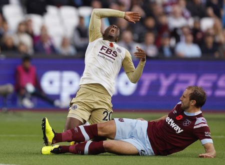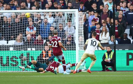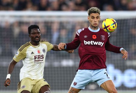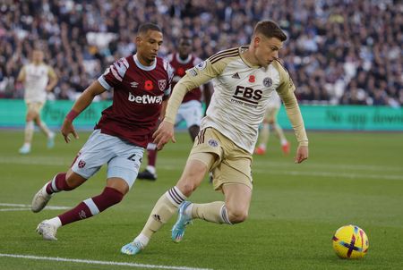 LONDON (Reuters) -Leicester City beat West Ham United 2-0 with goals from James Maddison and Harvey Barnes on Saturday to complete a hat-trick of away wins in the Premier League, though Maddison gave England fans a brief scare when he went off for treatment.